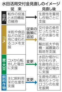 農林水産省は5日、主食用米から麦、大豆、飼料作物などへの転作を支援する「水田活用の直接支払交付金」の要件を緩和する方針を審議会の部会に示した。畑で栽培したものも支援の対象とし、批判の多かった水田維持のための「水張りルール」を廃止。食料自給率の引き上げに向け、麦や大豆を増産するための支援を拡充する。27年度から実施する。