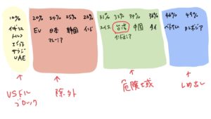 上記の図を見ると、関税率10%の国(イギリスと中東)がアメリカドルのブロック経済圏となります。