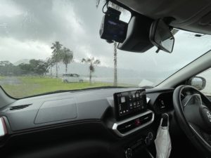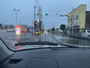 キャンプ場に向かう途中は豪雨でしたわ。