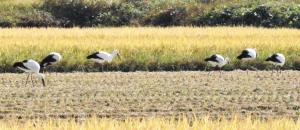 くちばしや翼の先が黒く脚が赤いのが特徴。湊地区自治公民館長の稲満一郎さん(73)は、「車を運転中に1羽が目の前を飛んでいき、先を見たら他の仲間もいた。ツルより大きく、田んぼで伸び伸びと過ごしていた」という。約1.8キロ離れた国分福島の田んぼでも同日午前、近くの西郷重則さん(85)が6羽を目撃した。