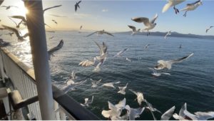 朝日を見ながらカモメさんとたわむれる
